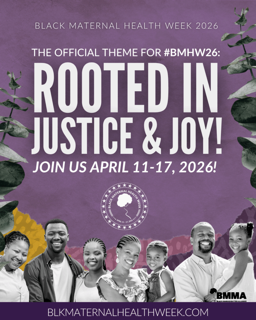 | This milestone theme celebrates a decade of grounding, growth, and collective care within the Black maternal health movement. Black Maternal Health Week (#BMHW26) is BMMA’s annual campaign to raise awareness, inspire action, and build community through amplifying the voices and lived experiences of Black Mamas and birthing people. This is the time to join BMMA in celebration as we mark 2026 as our 10-year anniversary. We honor the power of our collective movement, nurturing thriving families and shaping a liberated future rooted in justice, healing, and joy. |